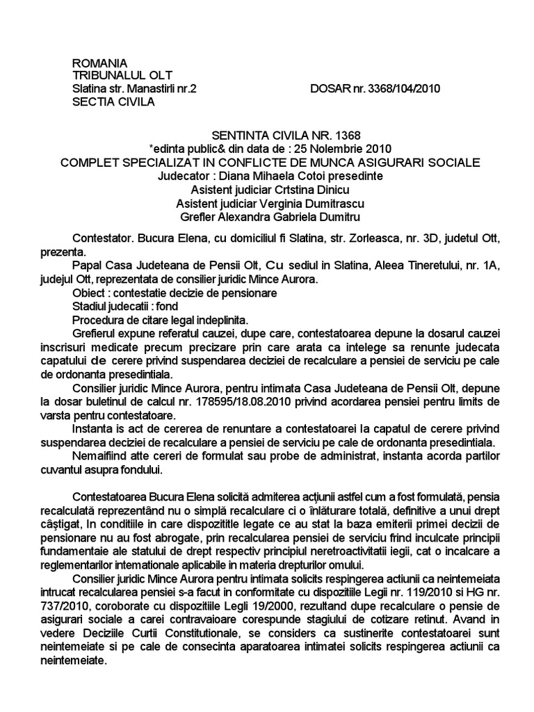 Dosare procese si exemple din jurisprudenta romaneasca(hotarari judecatoresti, spete, decizii) publicate de instanta de judecata tribunalul olt. Ei au cerut ca dosarul să se judece la o instanţă care se află la o distanţă mai.